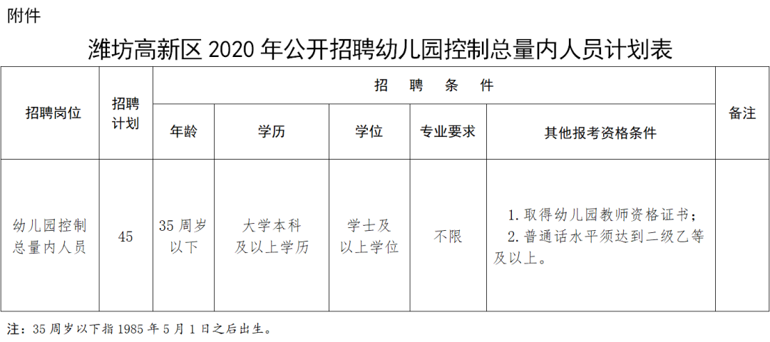 附件:潍坊高新区2020年公开招聘幼儿园控制总量内人员计划表